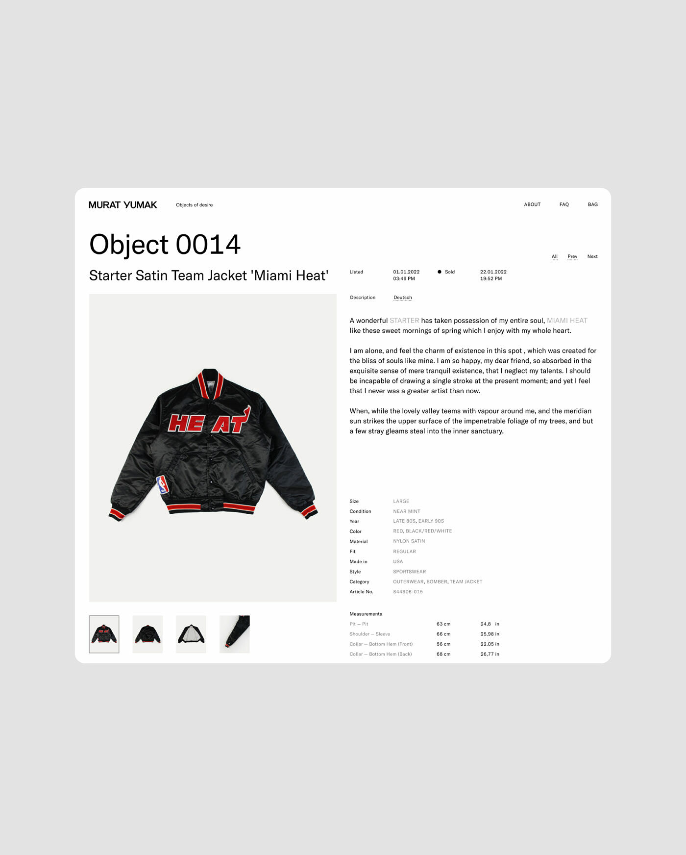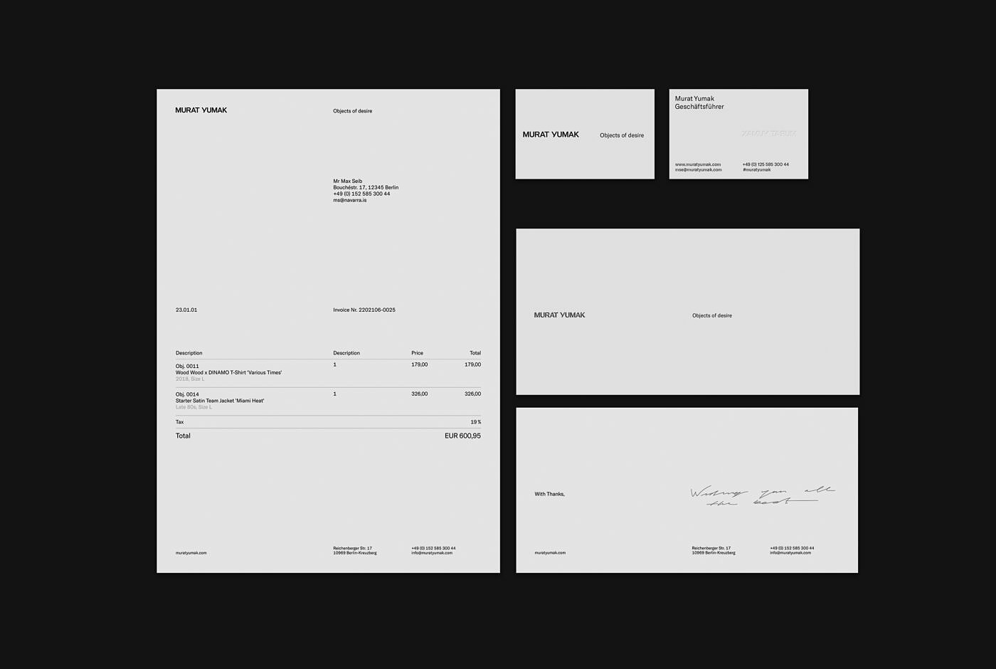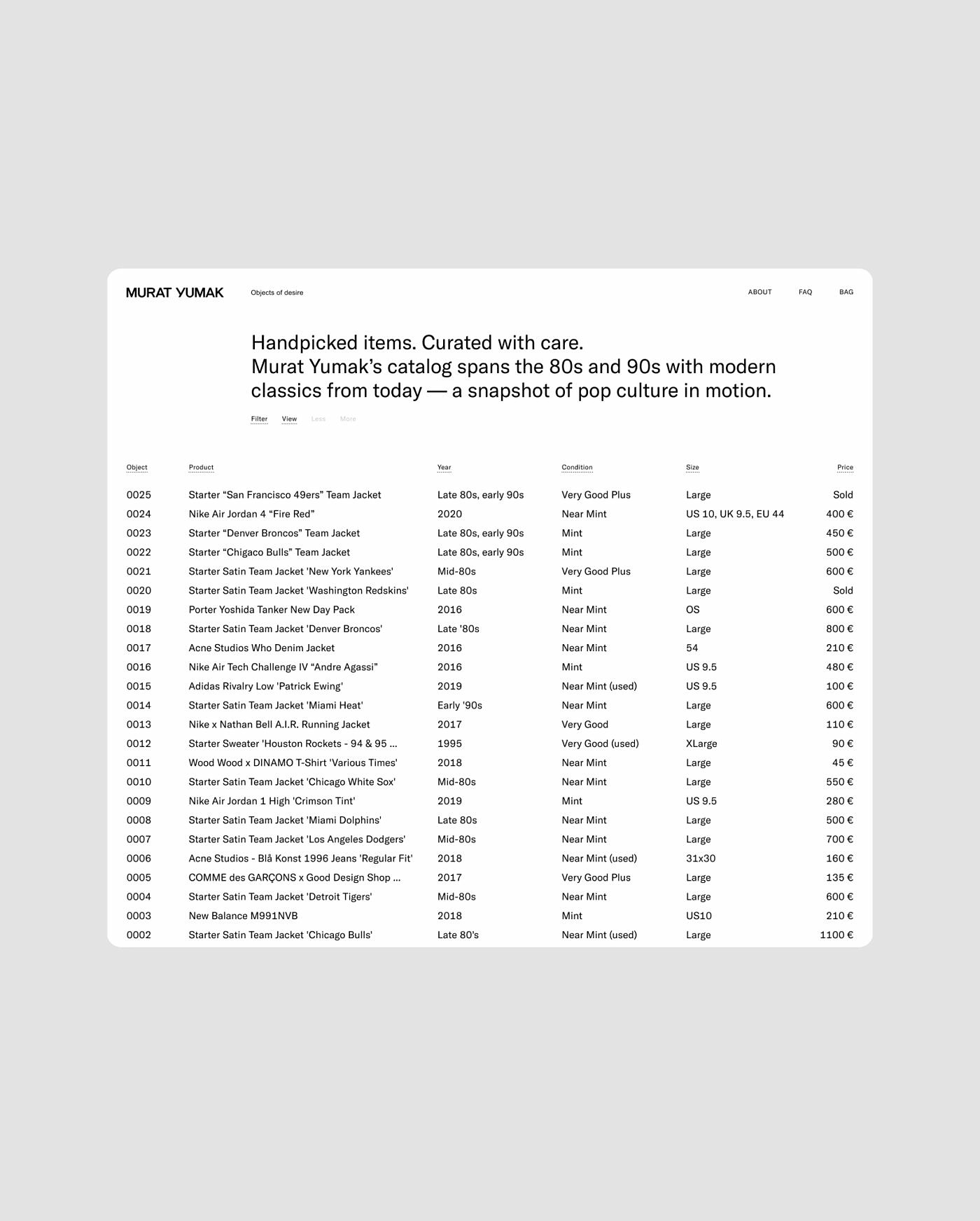 The word-mark reflects a style as distinctive as the person that Murat Yumak is. In comparison, the identity as a whole stands out for its simplicity. As apparent as it seems, the e-commerce solution was a digital exhibition catalog. The layout is based on a strict but user-adjustable image grid or a static text-only index of the products for a custom experience. Large sterile product pictures add to the museum-esque atmosphere. The products, when sold, stay visible, becoming part of the ever-present archive.