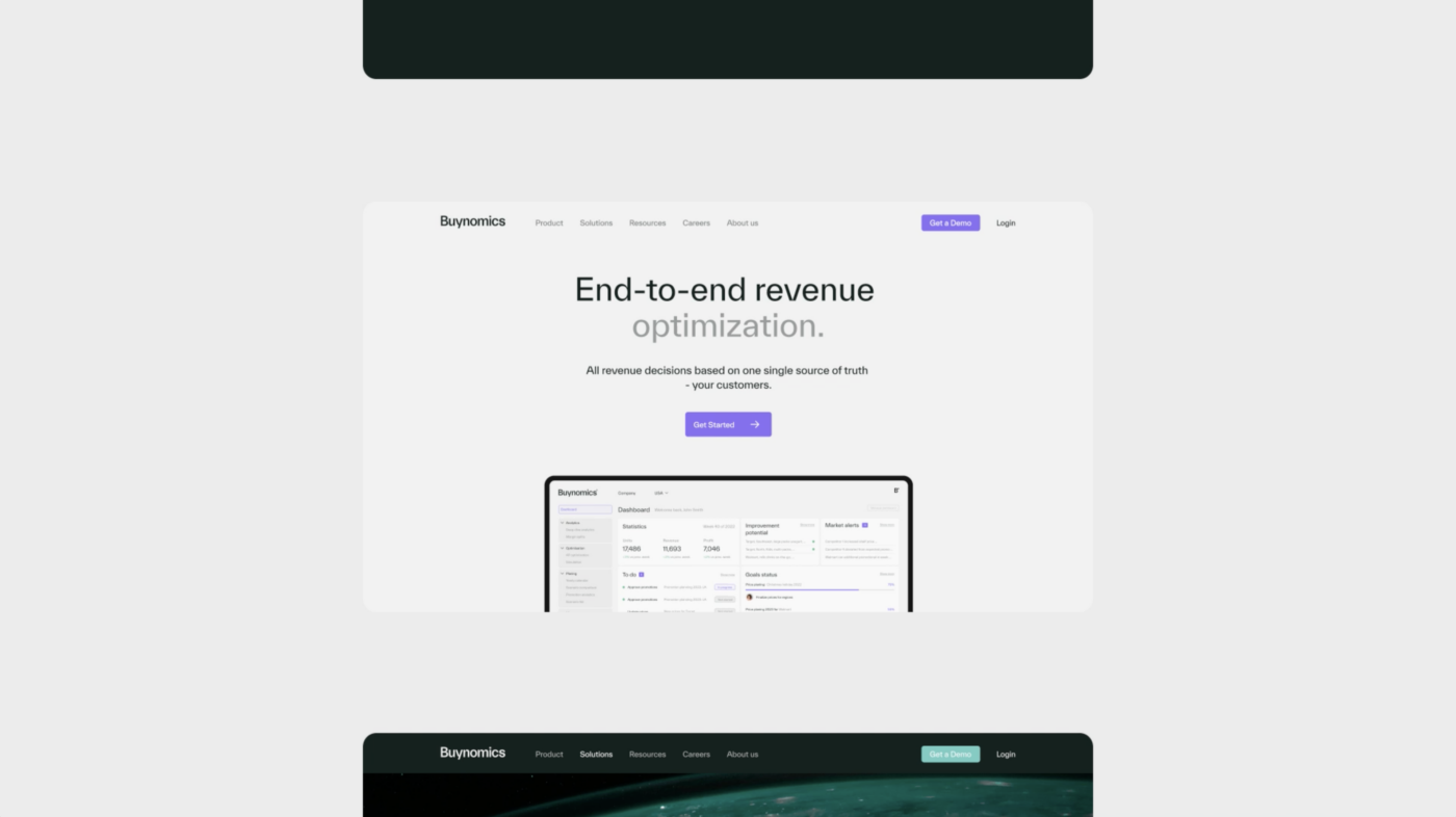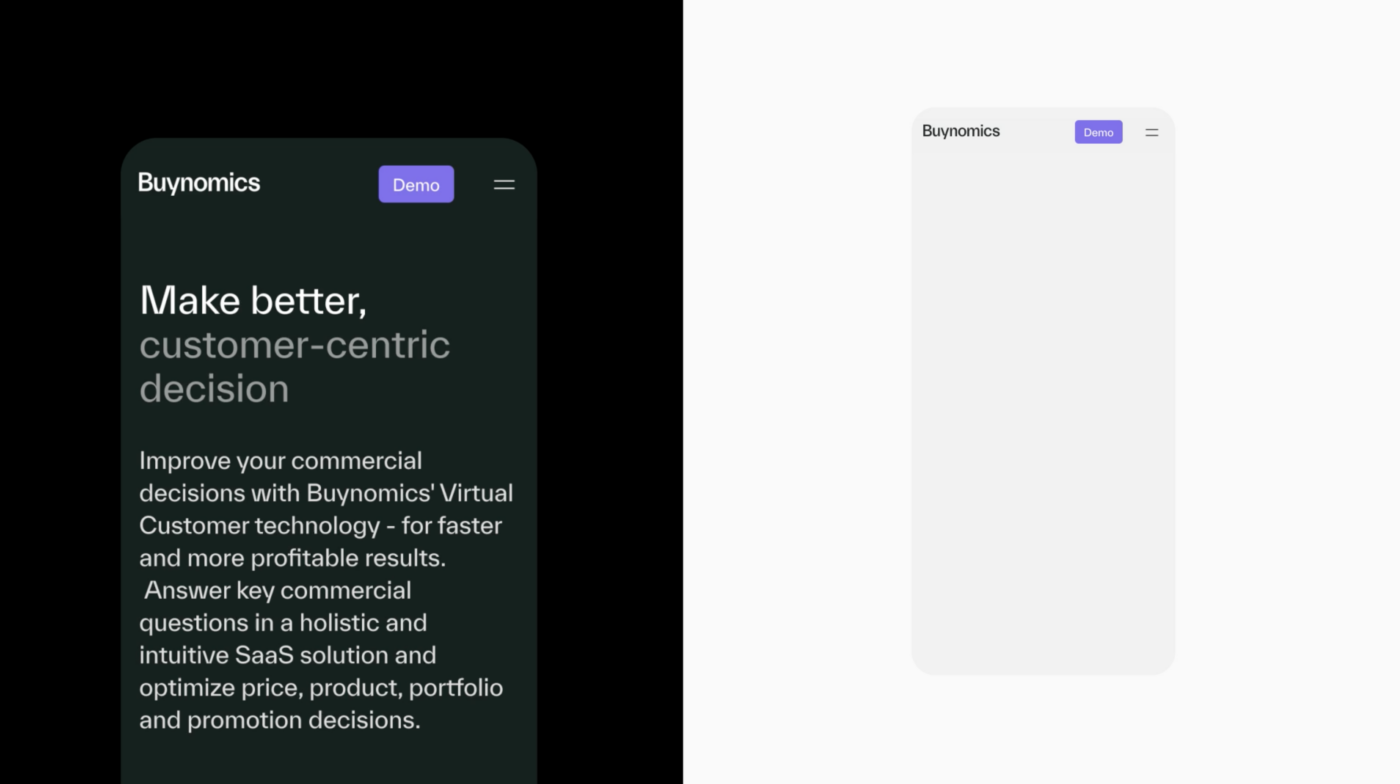 We used two themes, light and dark, to allow a distinct separation between the brand Buynomics and the software tool while still conveying consistent branding by using key design elements for both themes.This approach allowed a two-layer communication tailored to the brand needs for a distinctive brand image on the one hand and clear product communication on the other. We carefully choose a color palette for maximum flexibility to ensure a perfect contrast in dark and light environments. We also drew inspiration from computer terminals and consoles used in programming to underline Buynomics AI-driven services while also picking up cues from the brand’s defined tonality and values.
