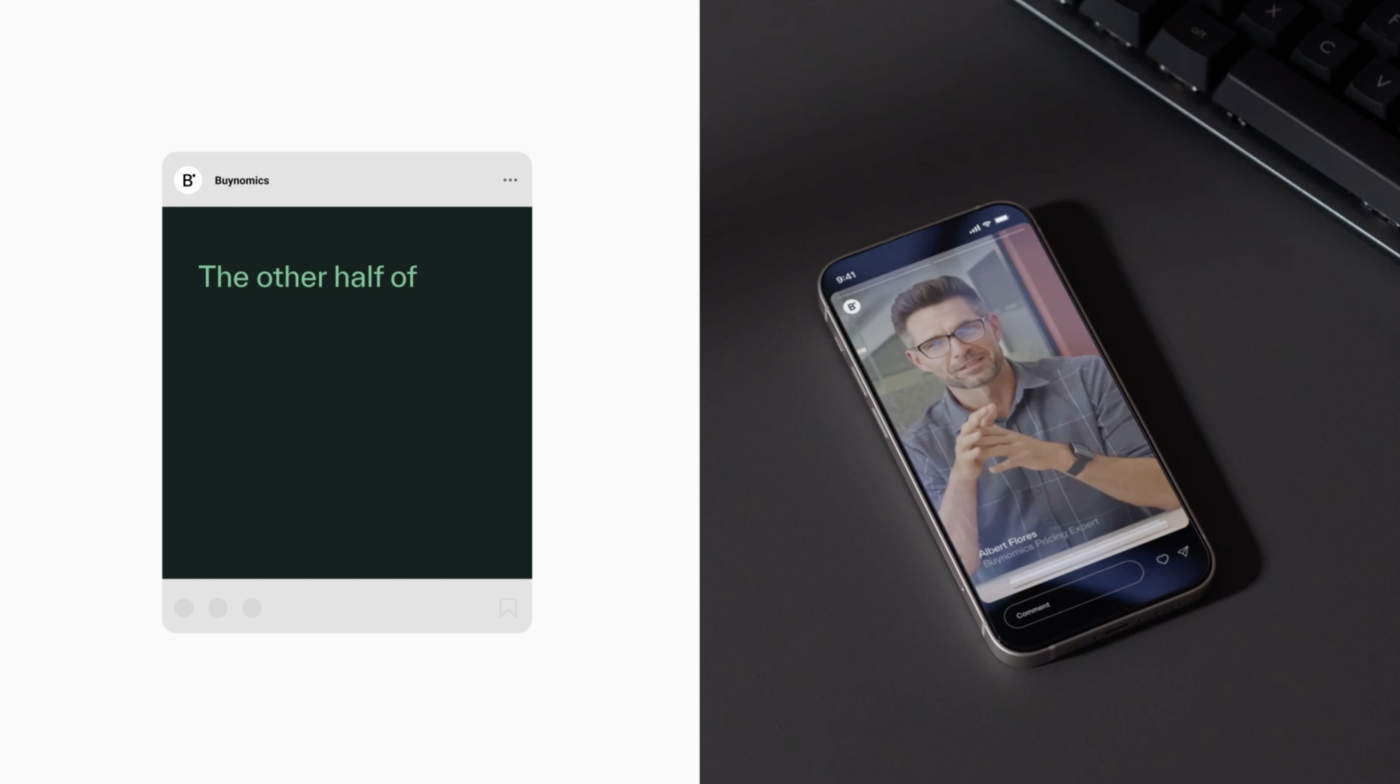 Buynomics had already defined its market segment and potential customer structures. However, our analysis revealed that the brand doesn’t adequately express a distinctive personality and differentiate itself from competitors, resulting in a generic and difficult-to-recognize brand image. A key issue of many B2B companies is as their sole focus lies on product benefits while neglecting to formulate an identifiable and tangible personality. Thus, our strategy concentrated on a holistic approach, channeling the product solution and its benefits in a sharpened and coherent brand identity with its unique tone of voice, attributes, and values.